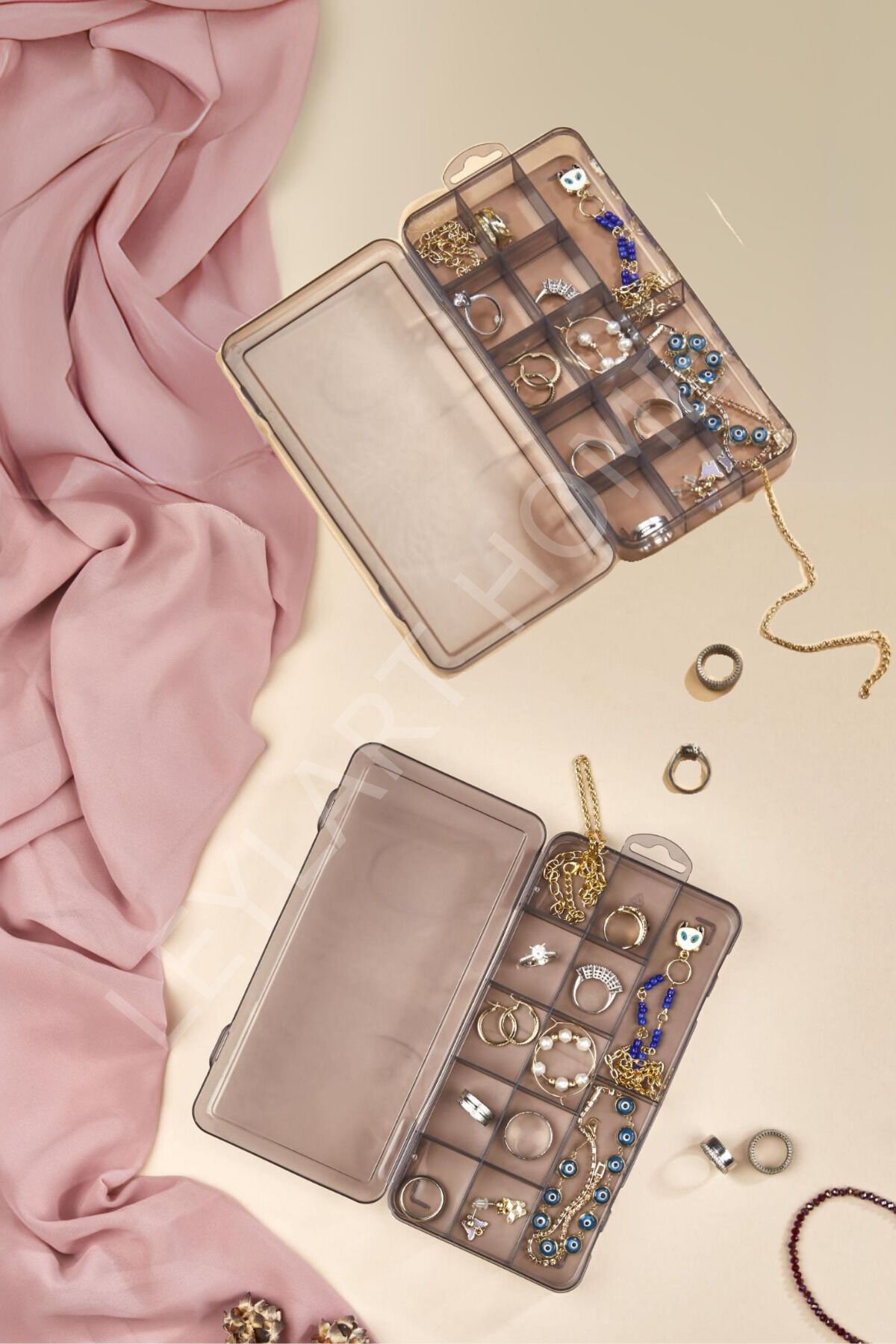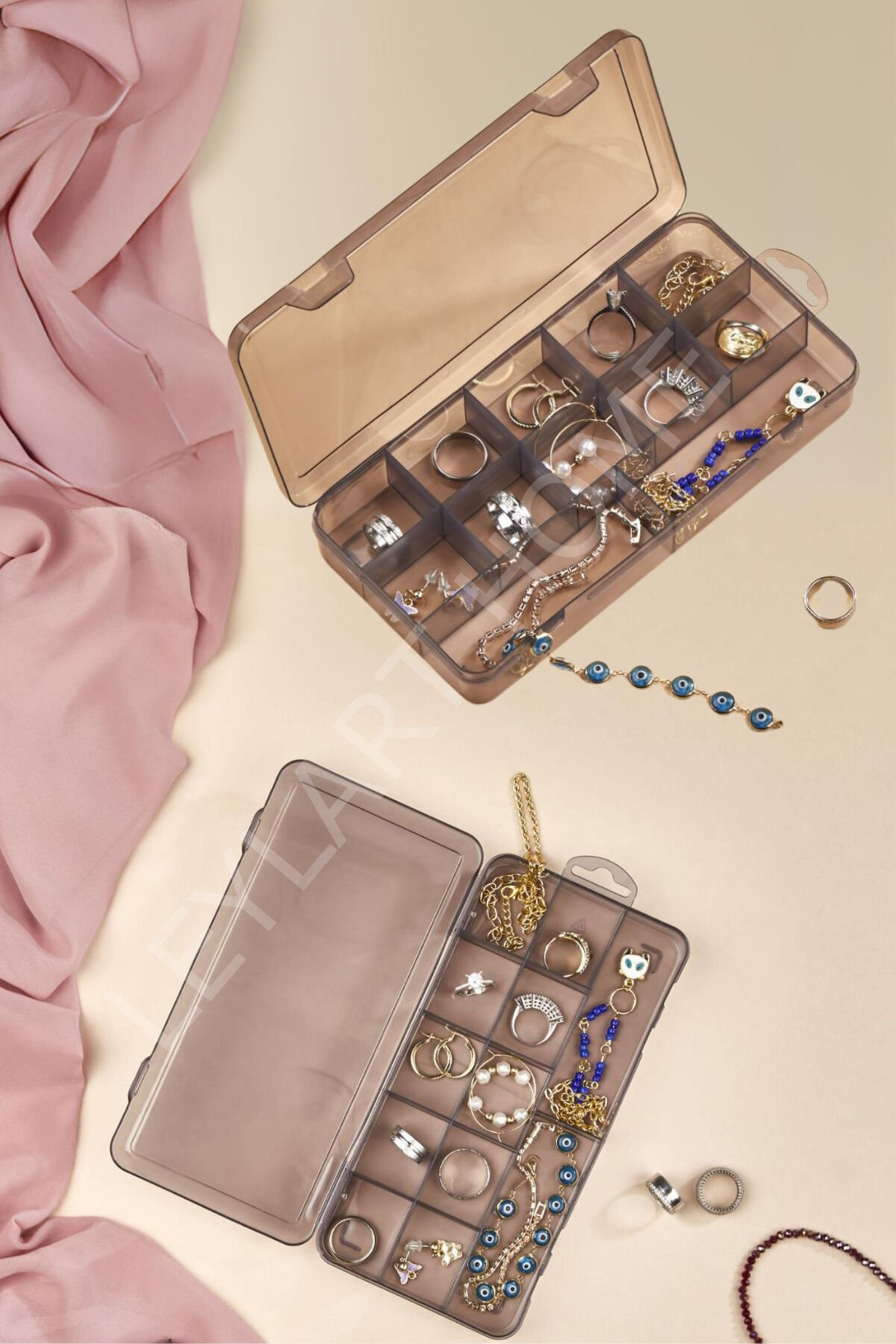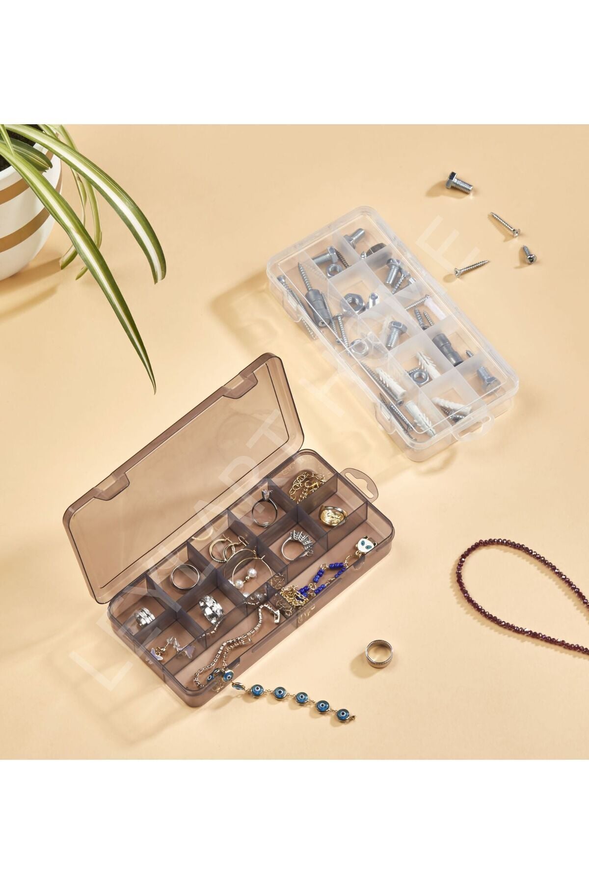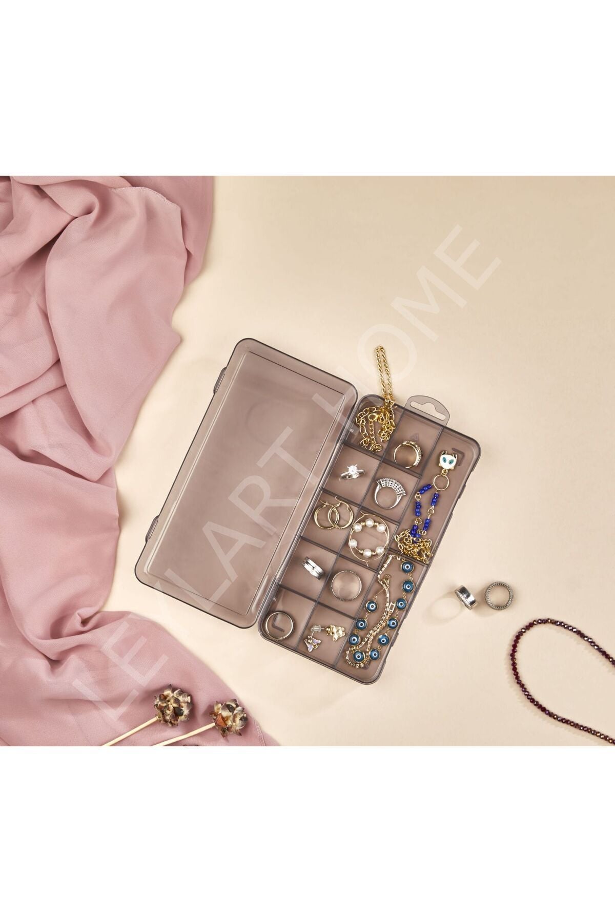 Şeffaf tasarımı sayesinde içerisindeki eşyaları kolayca görebilir ve ihtiyacınız olanı hızlıca bulabilirsiniz; 15 bölmeli yapısı ile takılarınızı, kolye ve yüzük gibi küçük eşyalarınızı düzenli bir şekilde saklamanızı sağlar; Dayanıklı plastik materyali ile uzun ömürlü kullanım sunar ve kolay temizlenebilir özelliğiyle hijyenik bir saklama alanı oluşturur; Kapaklı tasarımı sayesinde toz ve nemden korunarak takılarınızın daha uzun süre yeni gibi kalmasına yardımcı olur;