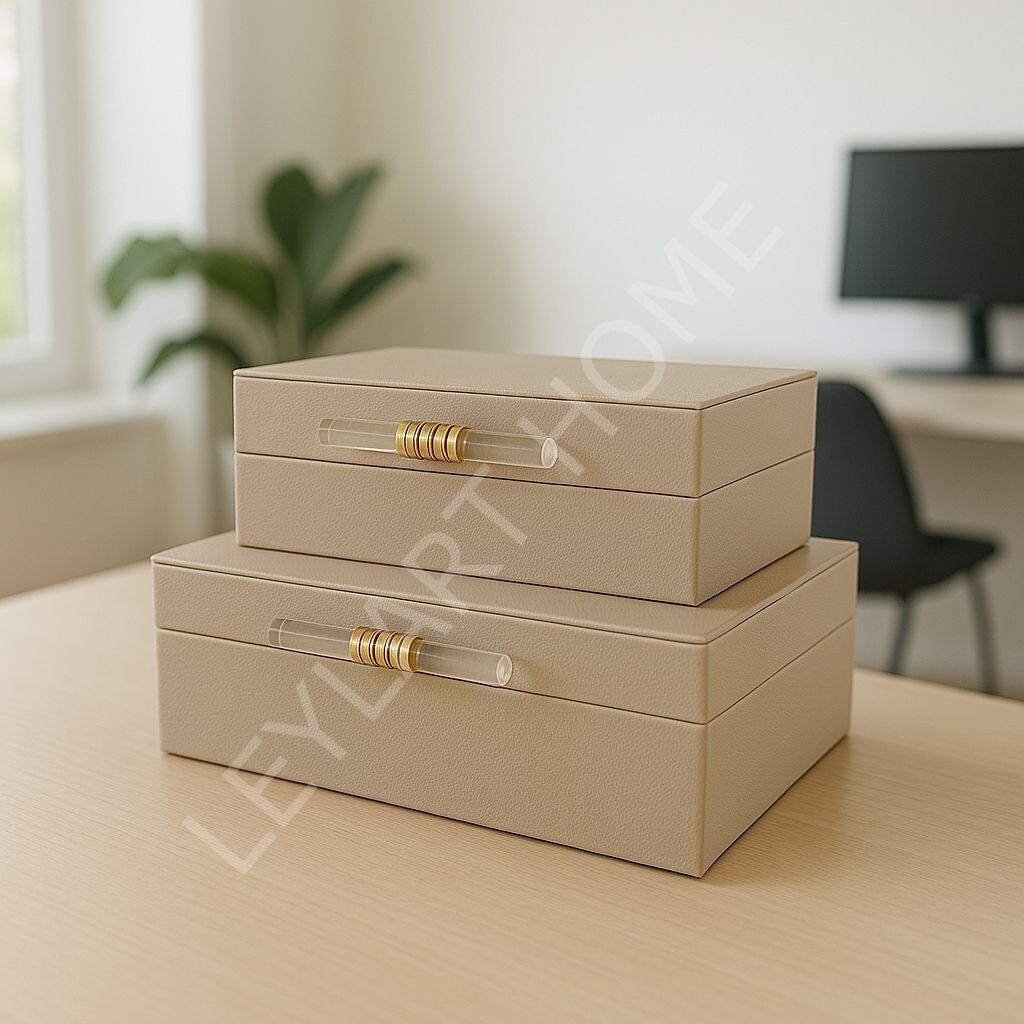 Modern yaşam alanlarının vazgeçilmezi olan akrilik kulplu saklama kutusu seti, zarif tasarımı ve fonksiyonel yapısıyla dikkat çekiyor. Deri dokulu yüzeyiyle sofistike bir görünüm sunan kutular, şeffaf akrilik kulpları ve altın metal halkalarıyla modernliği ve lüksü bir araya getiriyor.