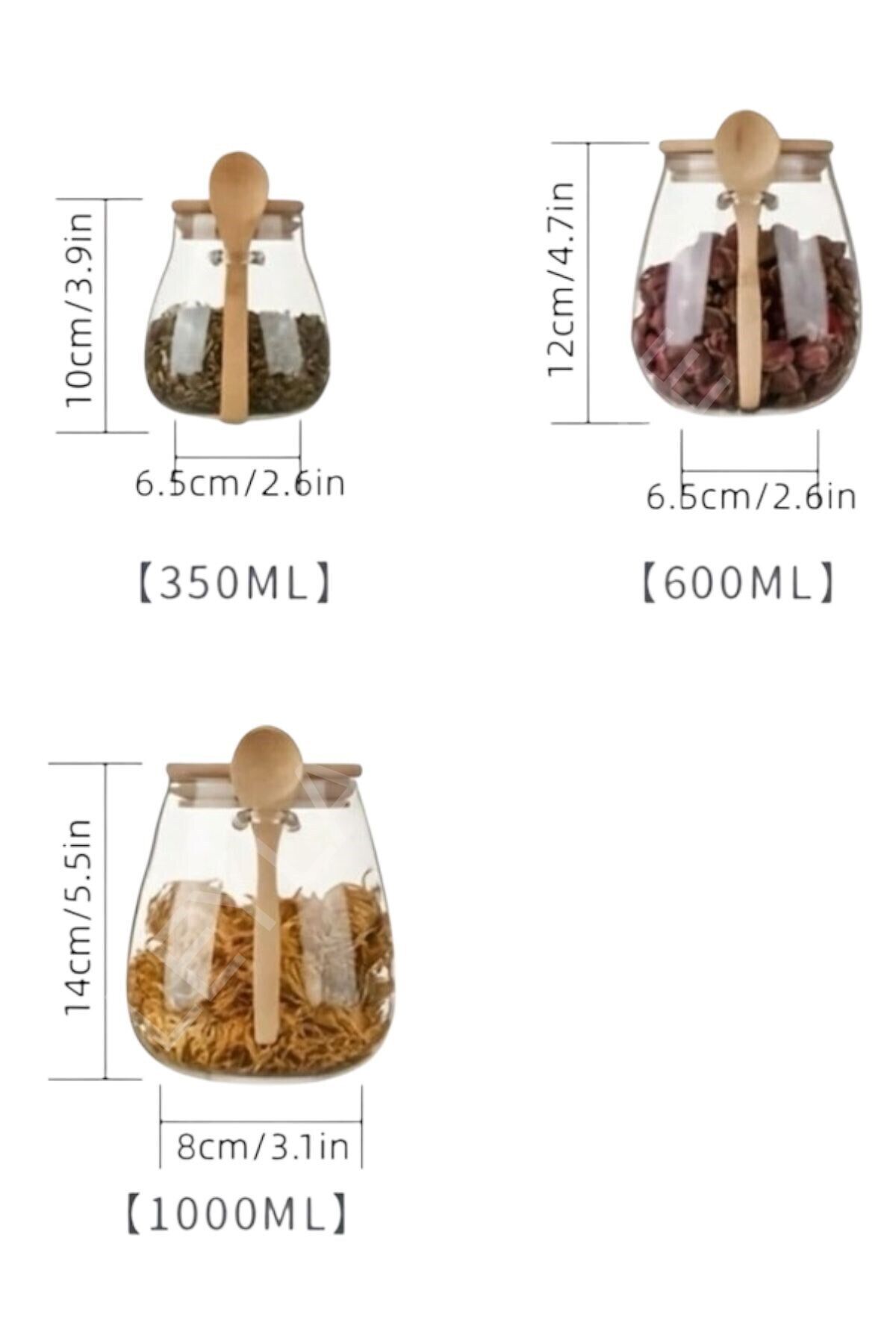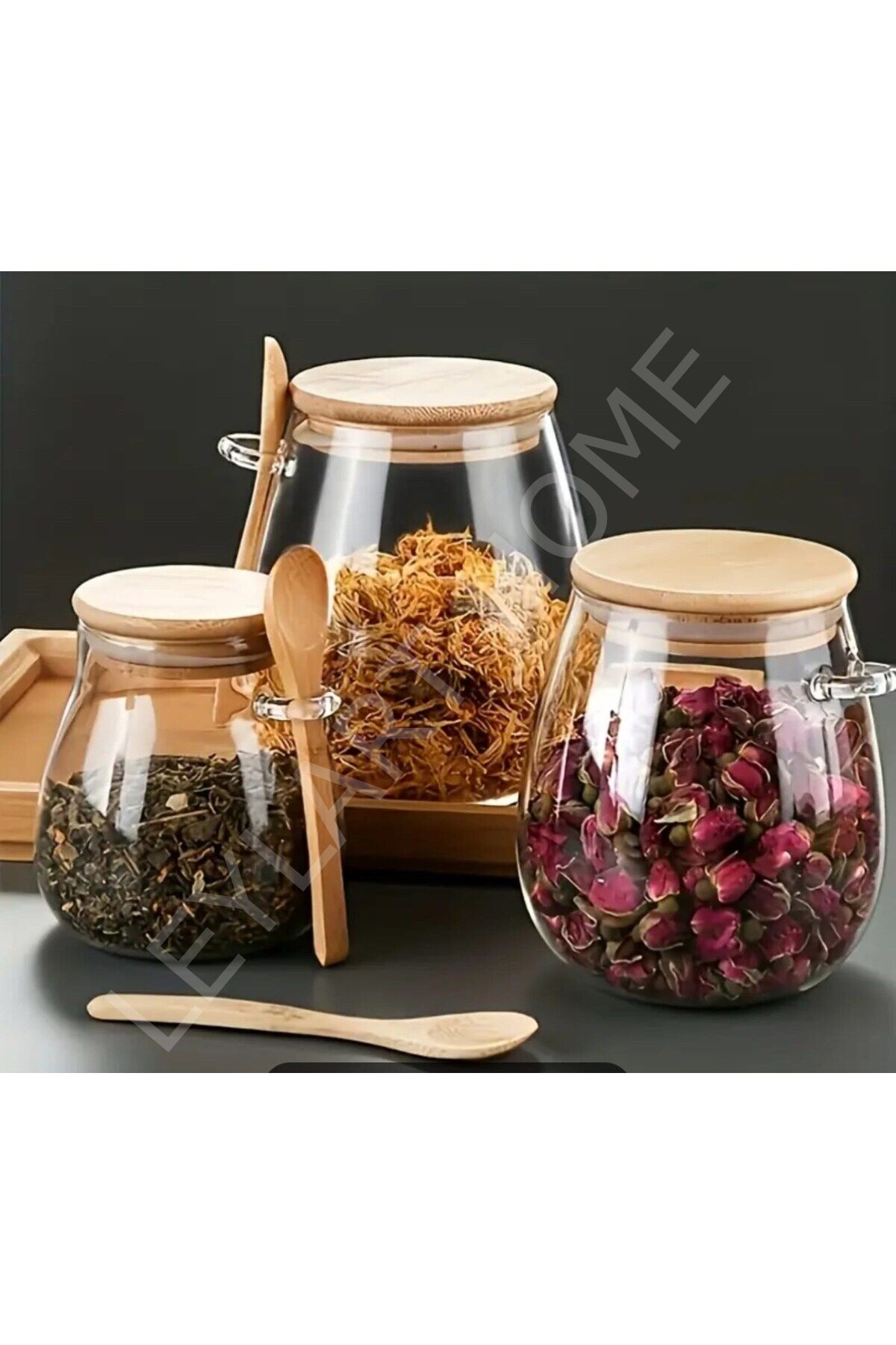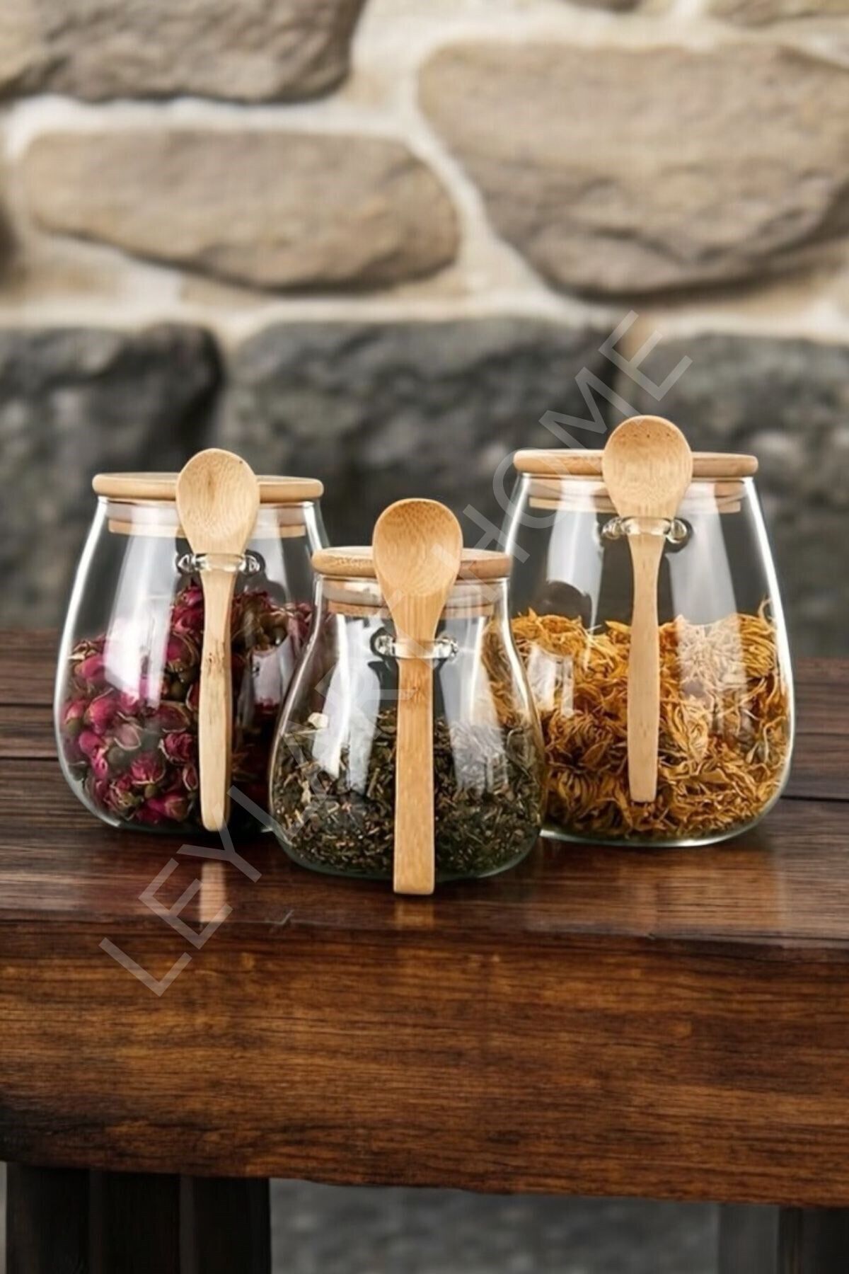 3'lü Tombul Borosilikat Cam Bambu Kapaklı Kavanoz Baharatlık Seti 350 -600-1000 Ml