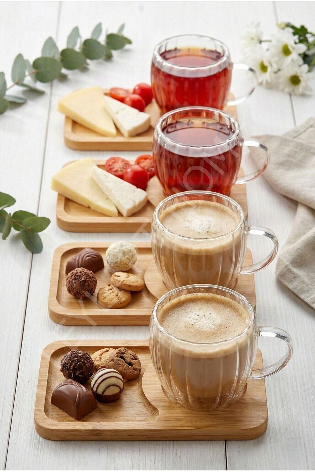 4 kişilik 8 Parça Çift cidarlı bardak ve bambu tabaklı