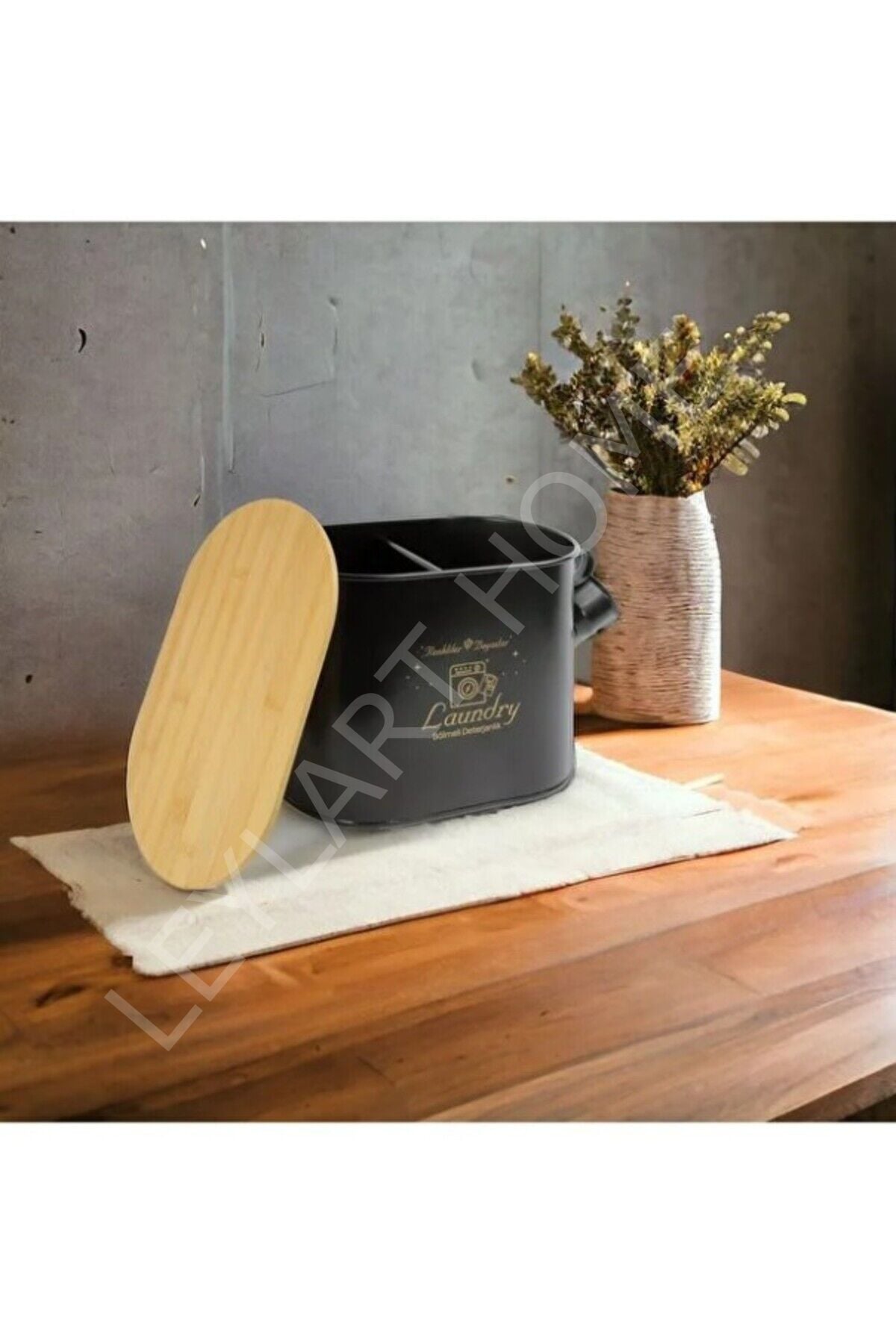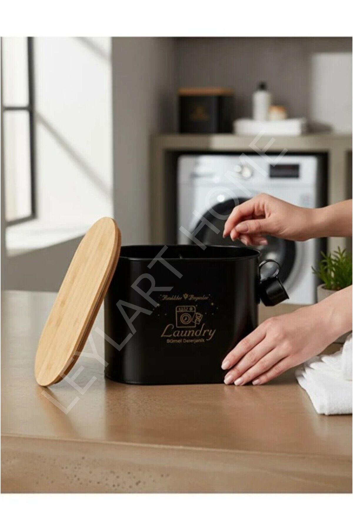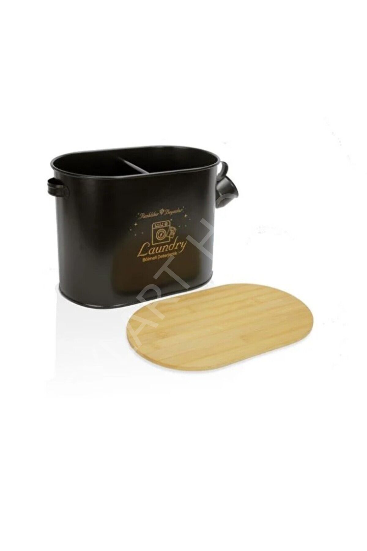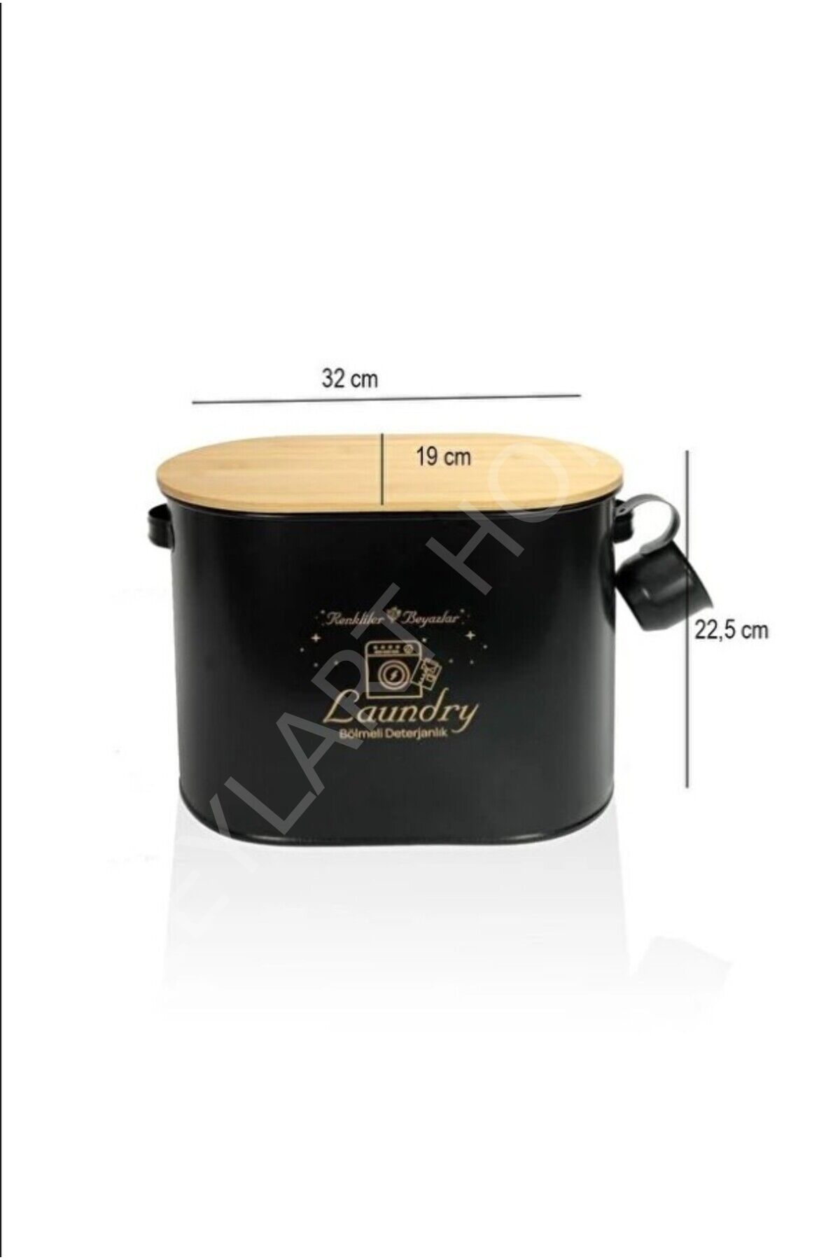 Metal gövdeli, bambu kapaklı, ölçekli siyah renkli deterjanlık, toz deterjanların düzenli bir şekilde saklanmasını sağlayan estetik ve işlevsel bir ürün olarak öne çıkıyor.; Ölçekli tasarımı sayesinde deterjan miktarını kolayca ölçmek mümkün olurken, metal gövde sağlamlık ve dayanıklılık sağlar.; Bambu kapak ise doğal bir görünüm sunar ve estetik katkı sağlar.; Bu tür bir deterjanlık, banyo veya mutfak gibi alanlarda kullanılabilir ve hem işlevselliğiyle hem de şık tasarımıyla dikkat çeker.; Siyah renk seçeneği, modern ve zarif bir görünüm sunar, ev dekorunu tamamlayan detaylardan biri olabilir.; Ürün ebatları 20cm genişlik 35cm uzunluk ve 25cm yüksekliğindedir.; Toz deterjanlığın 2 bölmesinin 12 Litre hacmi bulunmaktadır ve toplam 6kg-7kg toz deterjan kapasitesine sahiptir.; Paslanmaz ve 1.sınıf endüstriyel kalitede fırın boya ile kaplanmıştır.