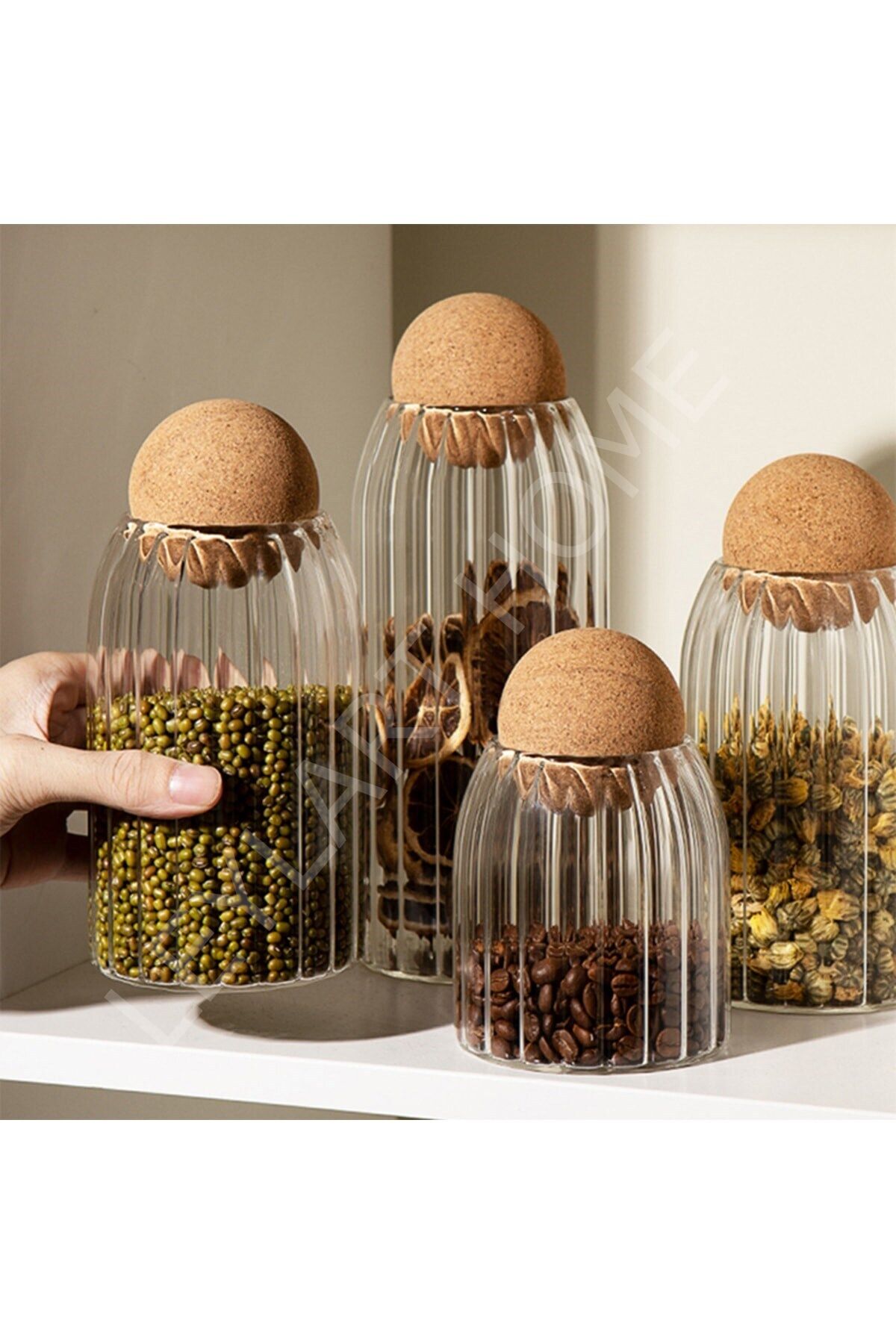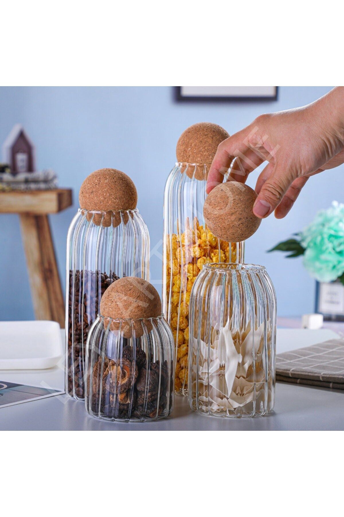 Çizgili Cam Kavanoz Seti 4'lü Top Mantar Kapaklı Baharatlık Seti
