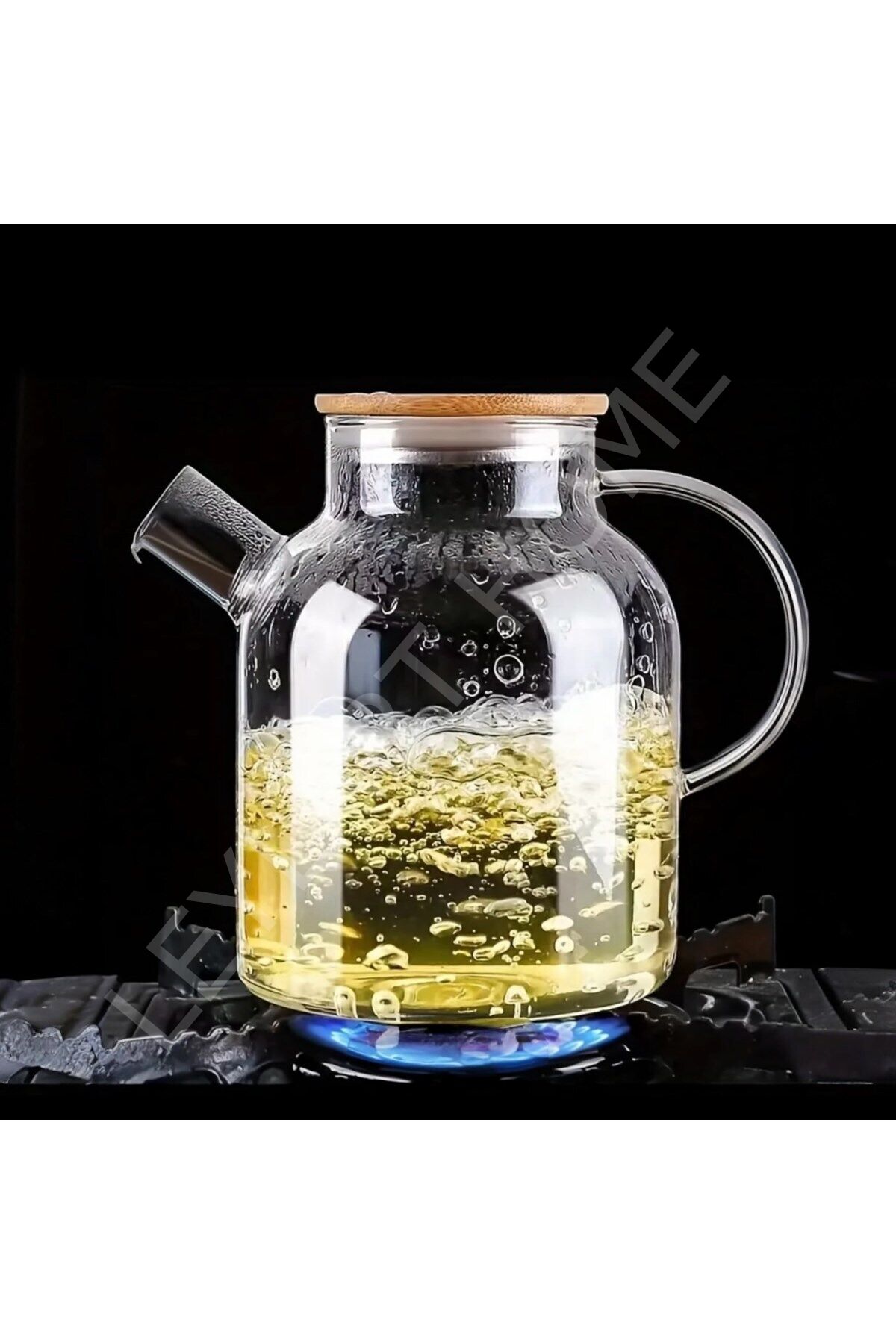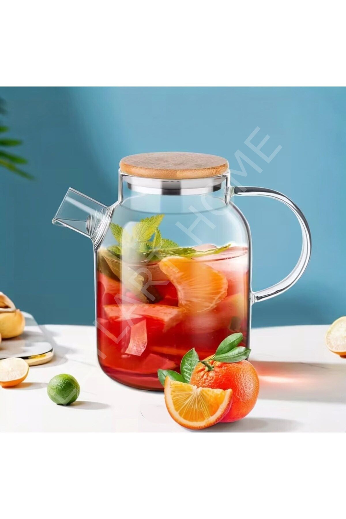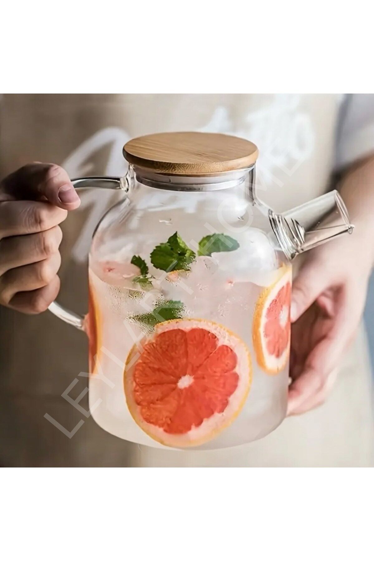 Isı Dayanımiklı Borosilikat Cam Demlik Sürahi – Bambu Kapaklı, Süzgeçli, Soğuk & Sıcak