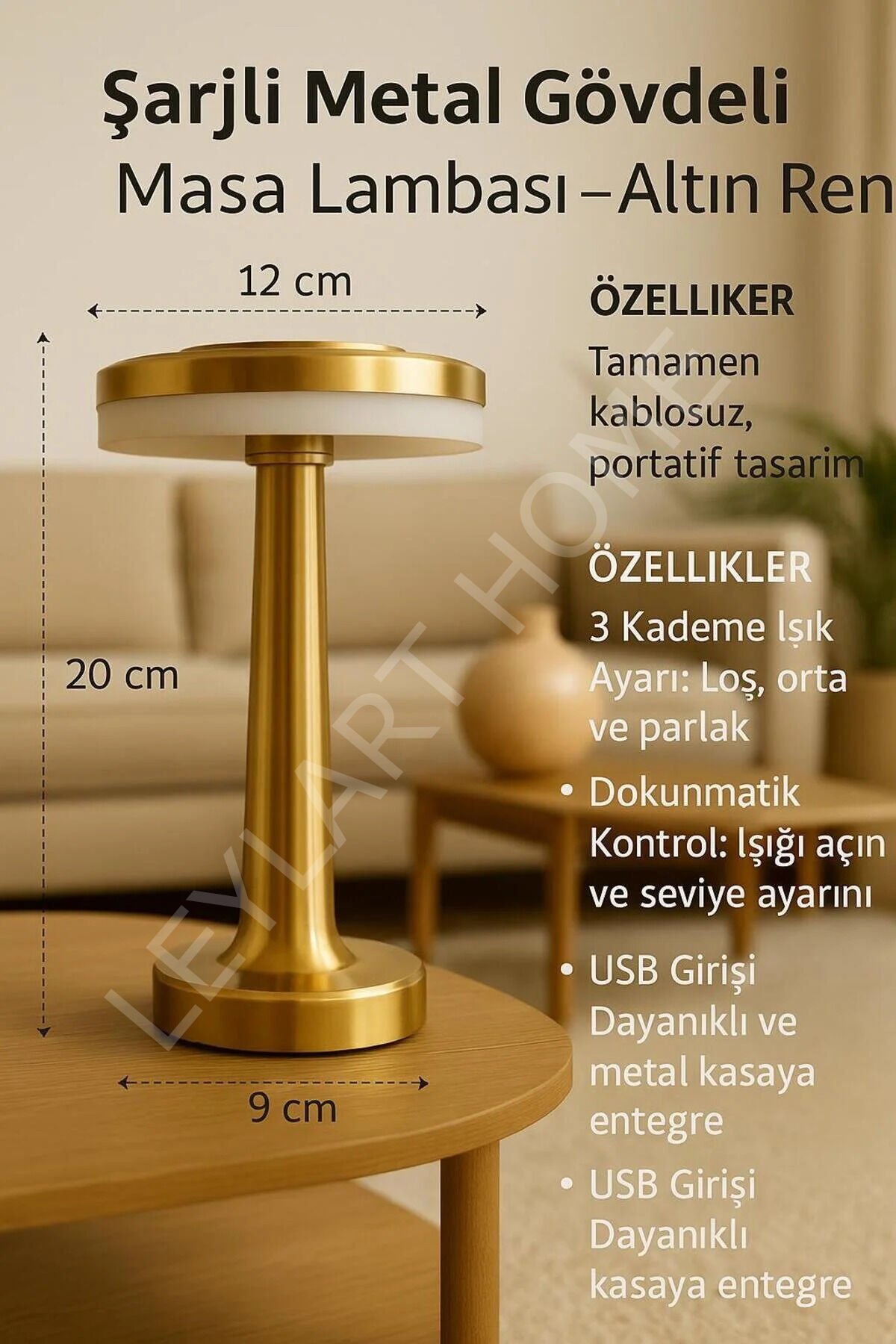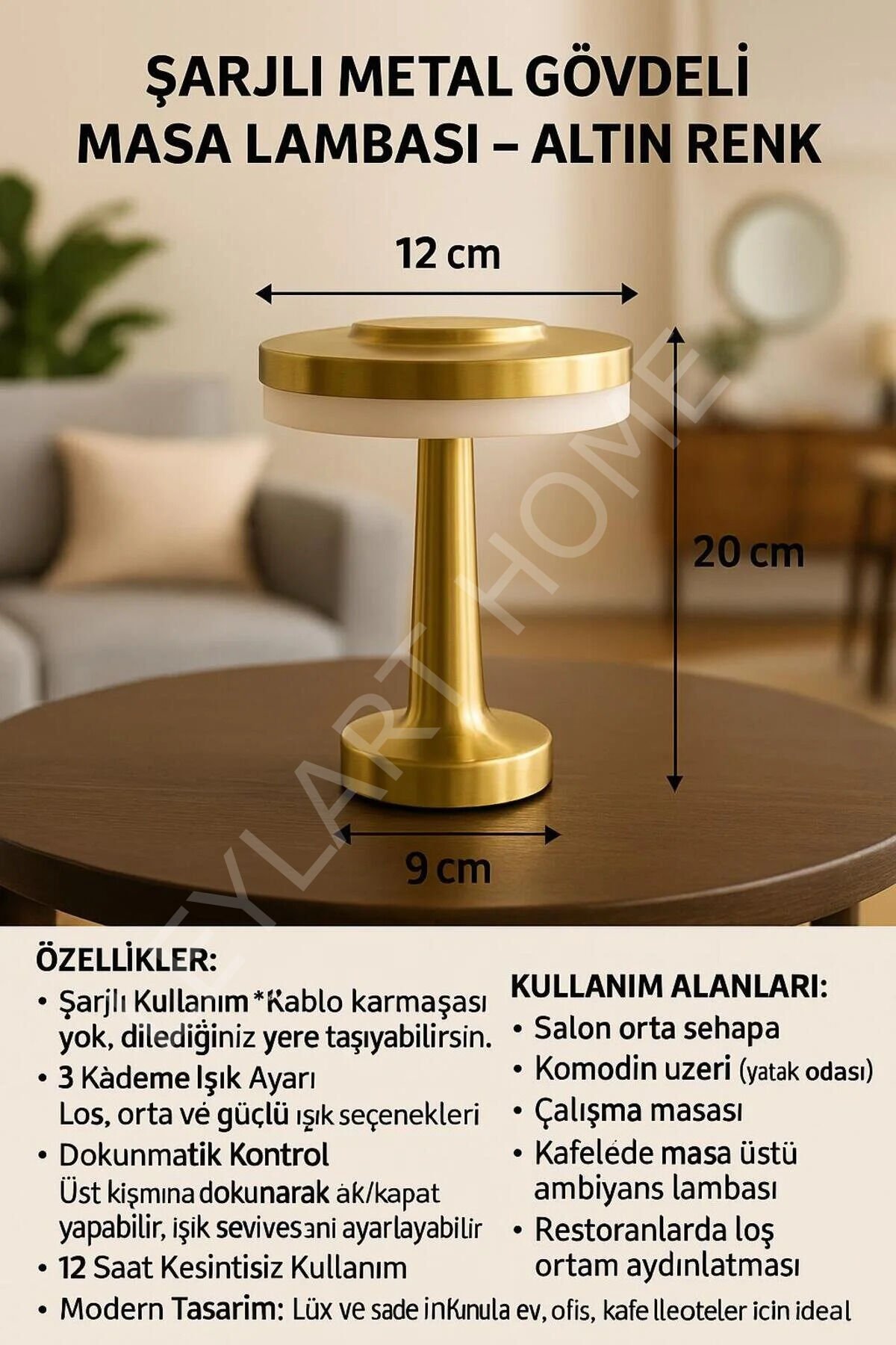 - Modern tasarımıyla dikkat çeken bu masa lambası, çelik malzemesi sayesinde uzun ömürlü kullanım sunar.; - Kablosuz şarj edilebilir özelliği ile kablo karmaşasına son vererek pratik bir kullanım sağlar.; - Güçlü performansı ve dayanıklılığı ile ön plana çıkan bu model, evinizin her köşesine estetik bir dokunuş ekler.; - USB girişine sahip olması sayesinde kolayca şarj edilebilir; böylece her zaman kullanıma hazır durumda kalır.; - Altın rengiyle zarifliği ve şıklığı masanızın üzerine taşıyan bu abajur, dekorasyonunuza sofistike bir hava katar.; - marka:ünalgrup Metalik materyaliyle modern çizgilere sahip olan bu ürün, hem işlevsel hem de görsel olarak etkileyici bir görünüm sunar.; - Diğer batarya tipini tercih eden kullanıcılar için idealdir; böylece farklı ihtiyaçlara uygun çözümler sunulur.; - Masa üstü kullanım için özel olarak tasarlanmıştır; çalışma alanınızdan aydınlatmayı eksik etmezken aynı zamanda rahatlıkla hareket etme imkanı tanır.