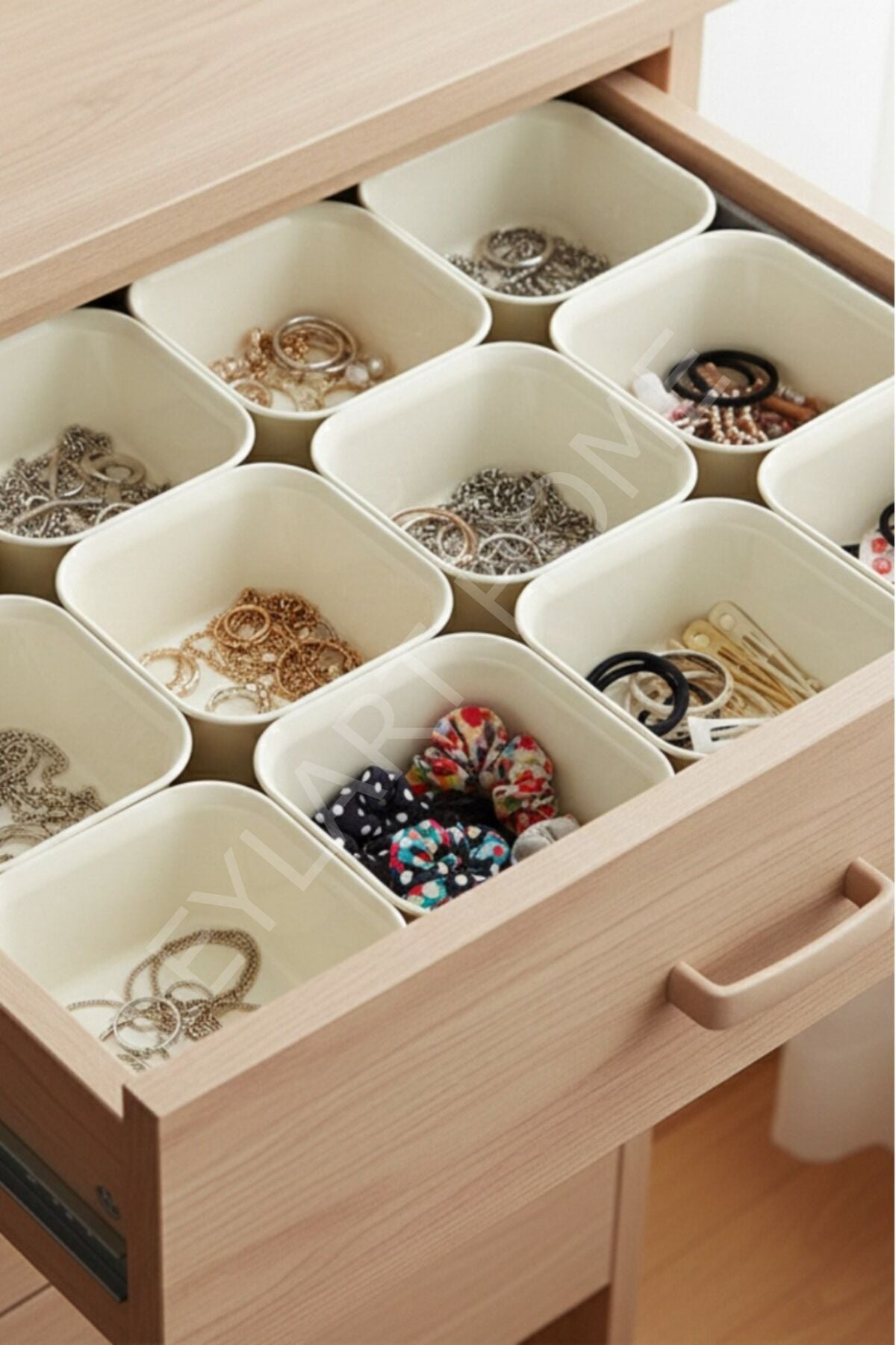 Takılarınız, tokalarınız ve küçük aksesuarlarınız artık dağılmasın! 9 bölmeli pratik çekmece içi organizer sayesinde aradığınızı saniyeler içinde bulabilirsiniz.; Dayanıklı malzemesi, modern tasarımı ve geniş iç hacmiyle hem şıklık hem düzen bir arada.; Kolay temizlenir, her çekmeceye uyum sağlar.; .;